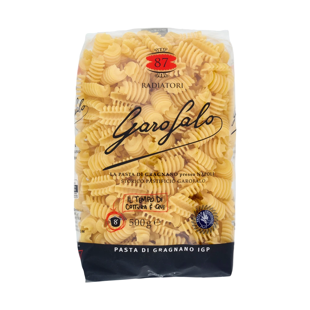 Classic Italian radiatori-shaped pasta, inspired by old-style radiators. The ridged, compact shape is ideal for holding thick sauces and creamy dishes. Made from high-quality durum wheat semolina for a firm, reliable al dente texture.